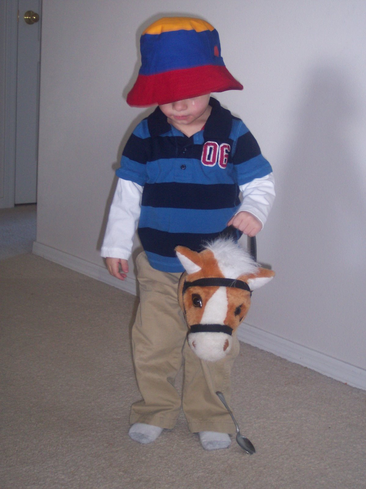 Today while he was riding the hat fell down over his eyes so he couldn’t see and he rode the horse right into the wall. Even though he was crying I couldn’t help but laugh. It was so funny and he wasn’t really hurt.