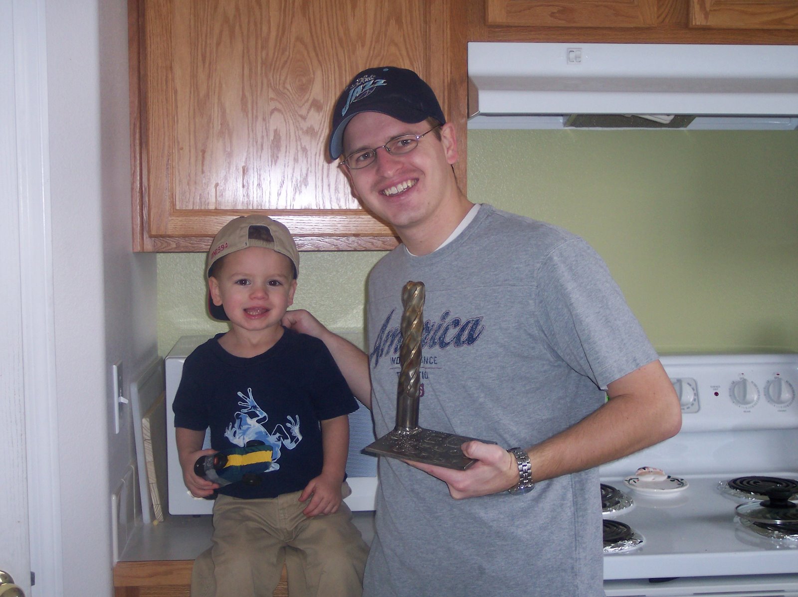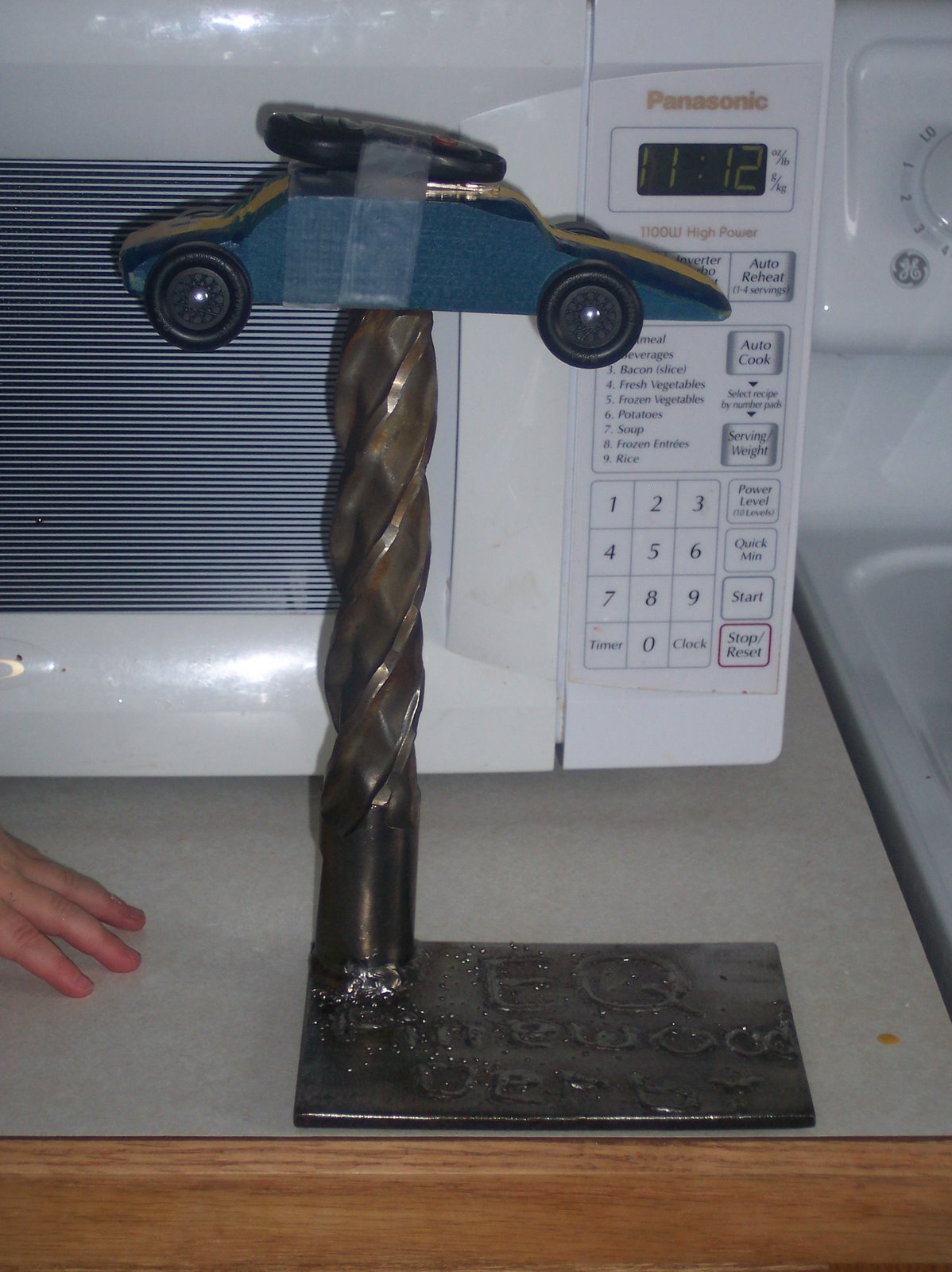 As he was leaving I jokingly said, “Hey, maybe it will win!” And surprisingly it did. This is the trophy. Richard said the best part was just watching Cameron. He loved the big race track and watching the cars crash as they shot off the end.