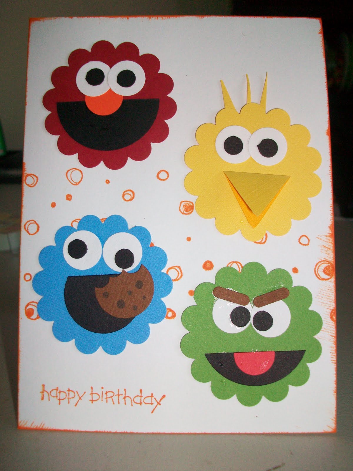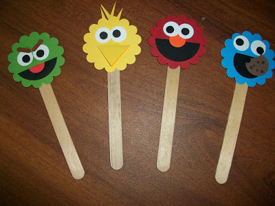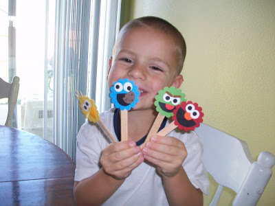 It’s random sometimes the things that delight children. This month for our card swap the theme was kid’s birthday and so I made a card featuring characters from Sesame Street. Cameron loved them and all while I was working on the cards he asked if he could have one. So when I finished I made a set for him and for Eli and glued them to popsicle sticks. (I love it when my pack-rat habit of saving things like popsicles sticks is justified!)