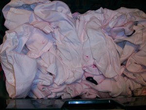 I guess I had it coming. All that nonsense about pink. I got pink alright. Somehow a magenta crayon made its way into the dryer during a cycle that contained the boys’s lights. Now all my children have pink clothes. I was much less delighted to find pink lint this time.