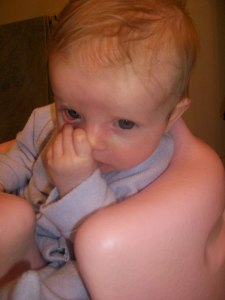 For hours I thought of the cruel methods by which I could prevent Miriam from perpetuating this bad habit. Making her wear those little baby mittens or putting that icky stuff on her tiny thumb. It all seemed too awful. By the end of the day I had determined I could not rob her of that peaceful place she resides with thumb in mouth. Even at the risk of orthodontics. Statistically speaking she is likely to need them anyway.