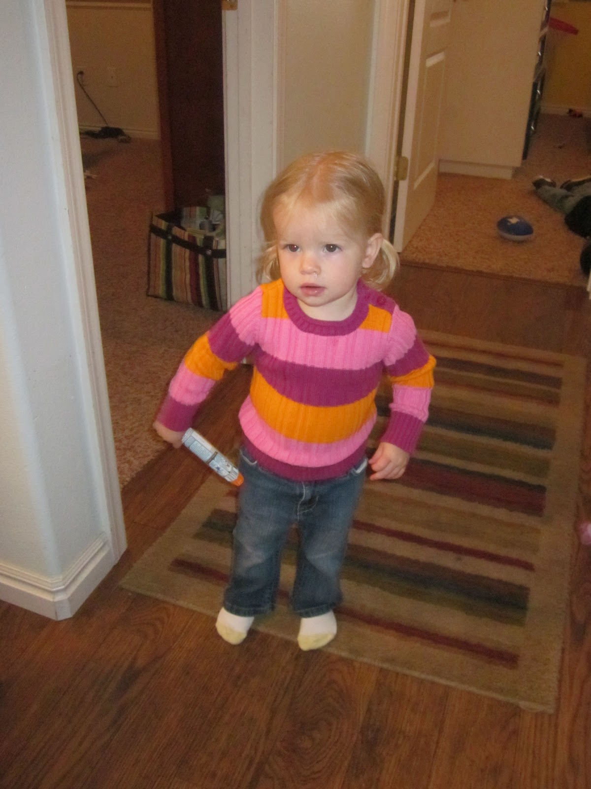 Later that evening the tv remote was missing. We searched high and low. Richard remarked “It’s probably with my chapstick.” Being DVR converts, the tv is worthless without the remote. We continued to look in every possible toddler hiding place and I finally found it in a basket in Cameron and Eli’s room. Sure enough the chapstick was in the same basket. It doesn’t seem so funny now, but we had a good laugh that cured us of our building frustration. That little girl has some crazy power over us.