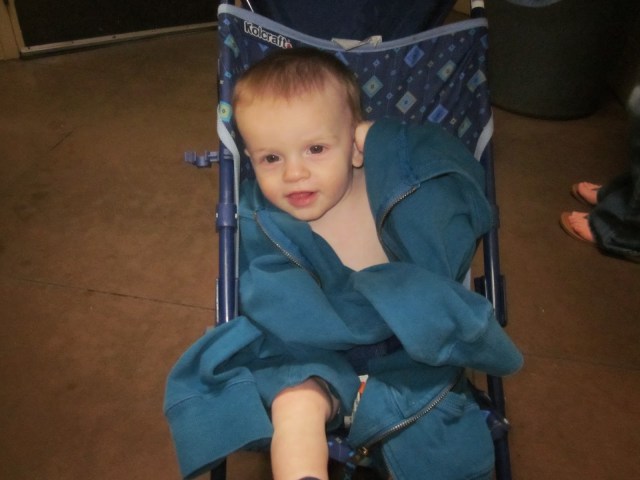 Simon had a soggy diaper that leaked through all his clothes, and if Simon were my first child I would have been prepared with a spare change of clothes in the diaper bag. But alas, the fourth child just gets wrapped in Baca’s sweater.