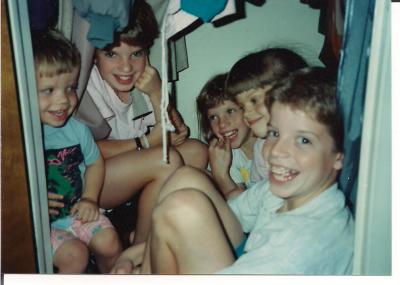 Some things never change… May 20, 2012November 16, 2018 / Jo Bird …like giggling siblings all hiding out in a closet. circa 1990 I’d be willing to bet $$$ that the picture on top was also taken on a Sunday. Kids get a little loopy and a lot creative on the Sabbath, but it’s ripe for bonding and memories. Share this: Click to share on X (Opens in new window) X Click to share on Facebook (Opens in new window) Facebook Like Loading... Related