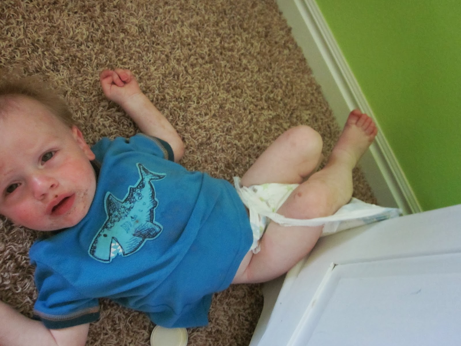 This is a look of total bewilderment and disdain that I am taking a picture instead of releasing him from his diaper trap. Another fourth kid problem- when I hear him cry I usually don’t respond immediately because most of the time the cry is short-lived and by the time I get there he is over it and I am not even sure what the fuss was about. This was NOT one of those times.