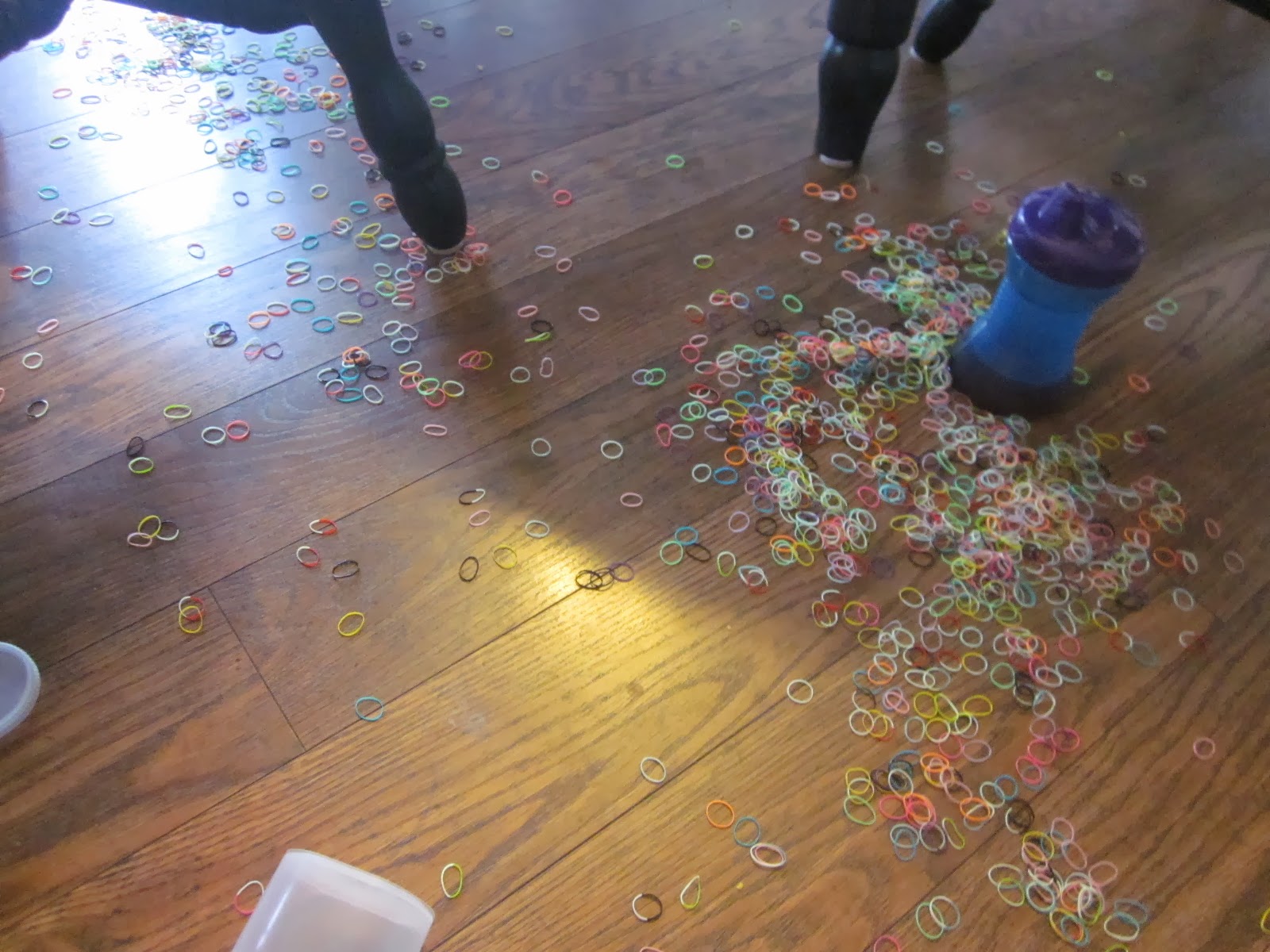 This must have happened after the Busy Hands post. It happened twice that day. Simon and/or Miriam dumped out all the plastic little hairbands. I made them help me clean them up the first time, but since that lesson apparently wasn’t effective, I just cleaned them up myself the second time.