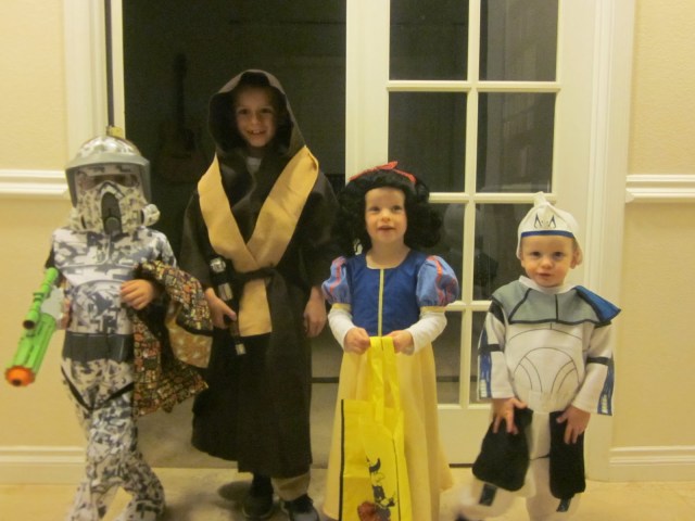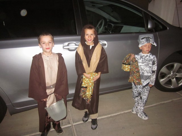 So we have Eli on the left- a Storm trooper. He asked for weeks to be a storm trooper but I kept holding out that I could convince him to be a jedi again, like Cameron and Charlie. But he was adamant. So at the last minute my friend Kim came to the rescue with this perfect costume, it was exactly what Eli wanted. *Sigh of relief* Halloween wasn’t ruined.