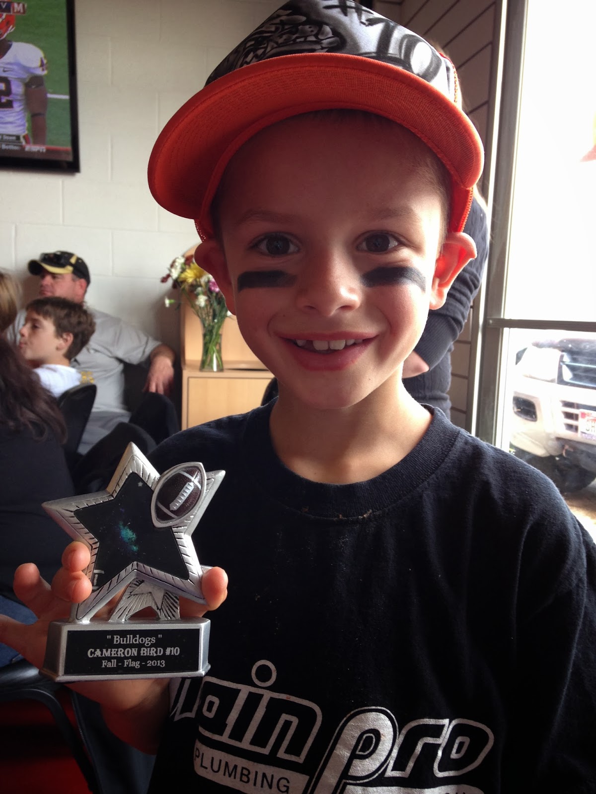 This year was Cameron’s last year of flag football. There were many parental discussions about whether or not to let him play tackle football next fall, he is small for his age and would have been up against kids twice his weight. Fortunately London made that a moot point!