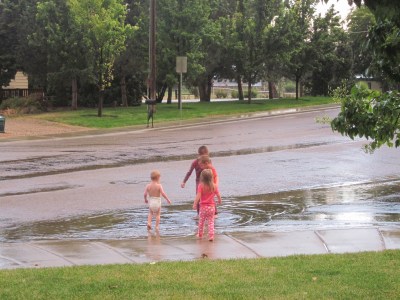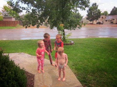 For a couple days in a row there were MASSIVE rainstorms. Maybe not by South American standards, but they were epic by Idaho standards. The second evening I let the kids go out in their pajamas and splash their little hearts out. This was at the end of the downpour, and there may have even been rainbows emerging. What’s not to love about storms? (Oh- broken trees. We had one of those.)