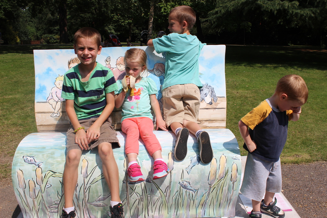 My friend Alison told me about these benches around London that have been painted “to represent a major landmark in literary history.”  I had forgotten all about it until we saw this one.  It is the first one we’ve seen. It depicts We’re Going on a Bear Hunt and it made me really excited to try and find more.
