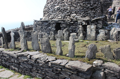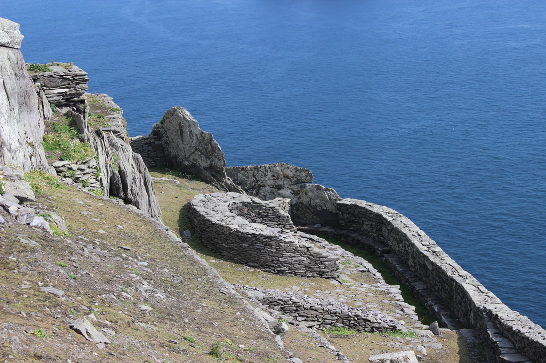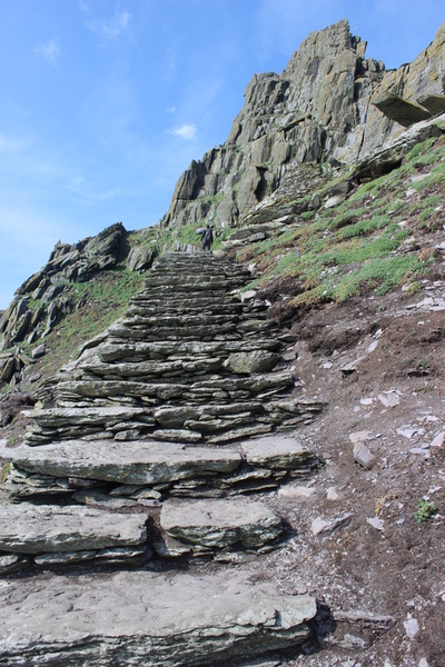 There are two peaks on Great Skellig, and the lower peak is the site of the monastery. It was built between 600-800AD and the monks built three staircases to the top. The staircases were all built with the rocks I’ve been mentioning so often, and the staircase we took to get to the monastery has something like 613 steps. There is now a lighthouse on the island so they have since built a road that goes around the periphery of the island at sea level, but the stairs were the only way up. And it should be noted that people have been killed falling off these staircases. Fortunately it was a dry day when we were there and the stairs were not slippery.