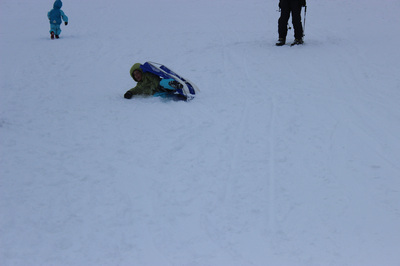We put all our snow clothes on and hit the hill. The kids were having fun, but we learned an important (and probably obvious, really) lesson quickly. Wellies are fabulous for keeping water/moisture out. But they are not adequate for keeping COLD out. Our poor toes were frozen in about 20 minutes. So we went back to the car to warm up and look for other sledding options. We had heard of a tube hill so we decided to try and find it.