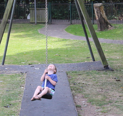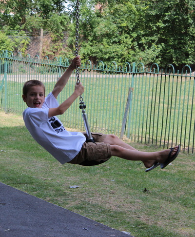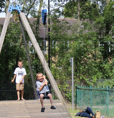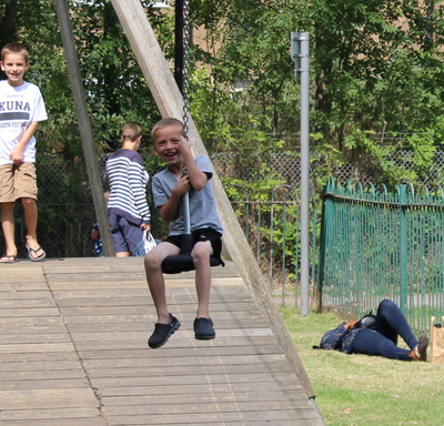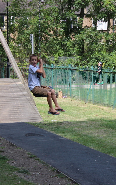 The park has several playgrounds- parks are seriously so spacious here, have I mentioned that? We skipped the first one because there was no shade and stopped at the second playground to eat our lunch. There was a zip line, swings, and various other playgroundish things. The zip line was the obvious favorite. I had a fun watching my kids zip their hearts out, but I also have fun watching little British kids “queue up” for these sorts of things. They get the concept of the queue but still love to shove and cut, and then there is always the diplomatic child who tries to keep things in order.