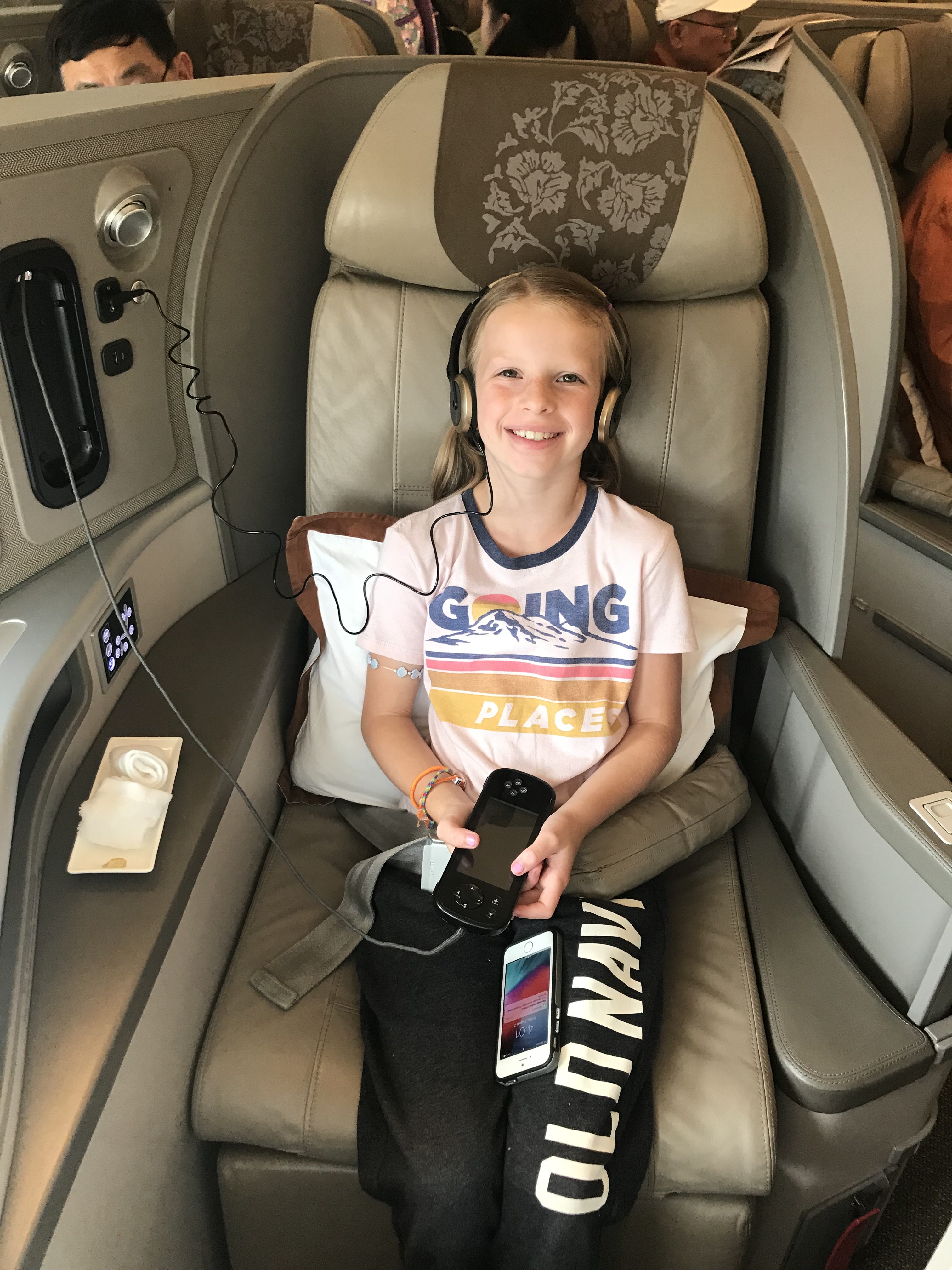 We had 18 suitcases, plus a backpack each, so Richard packed as many as he could into our rental van and then we ordered an Uber for me and the kids. Our flight check-in was tedious to say the least, but otherwise uneventful. KPMG allows us to fly business class and the advantages of this under the circumstances can not be overstated. (Although some of the other business travelers were not too thrilled to have our family of seven in their lines and their lounge.)
