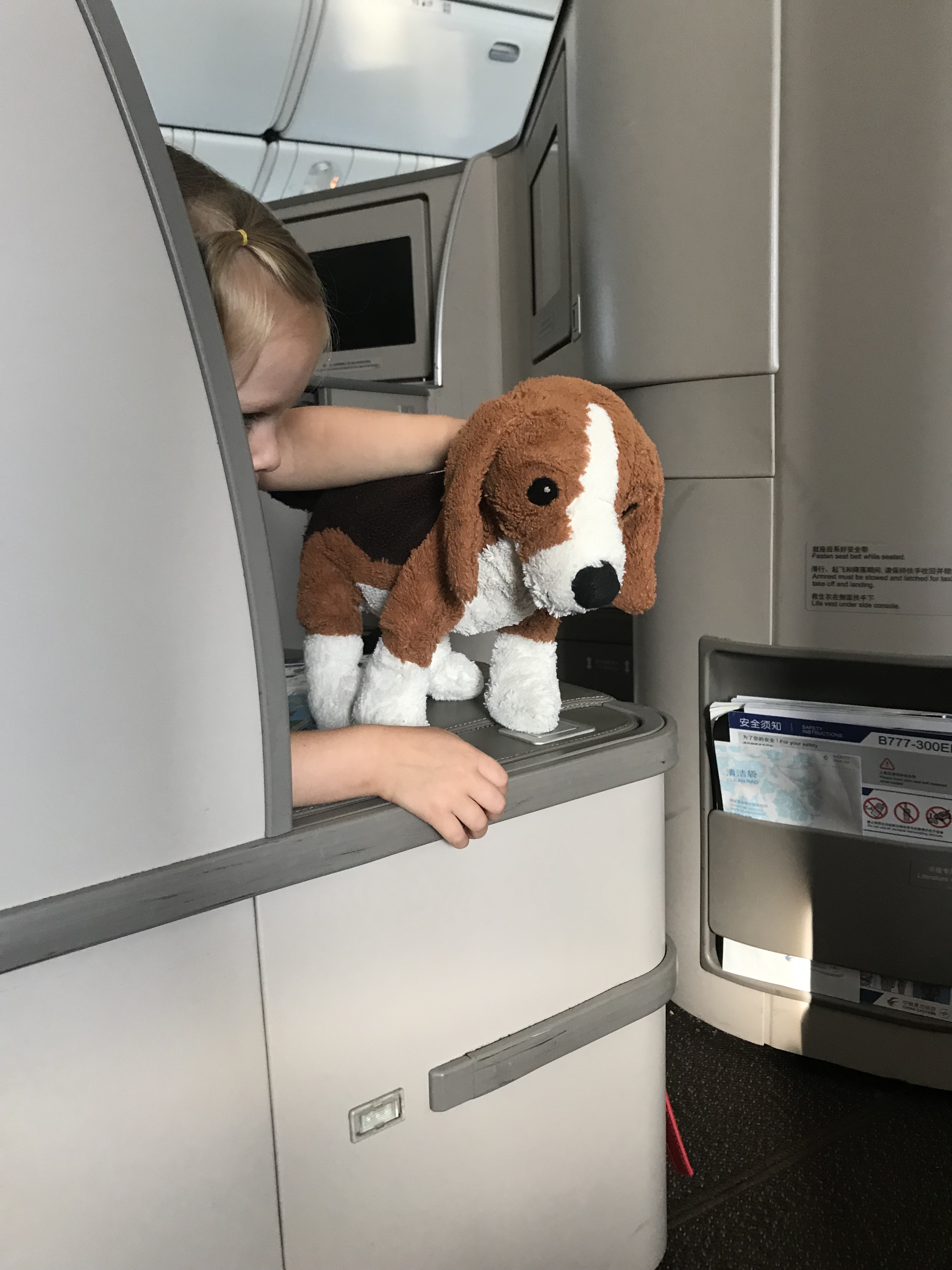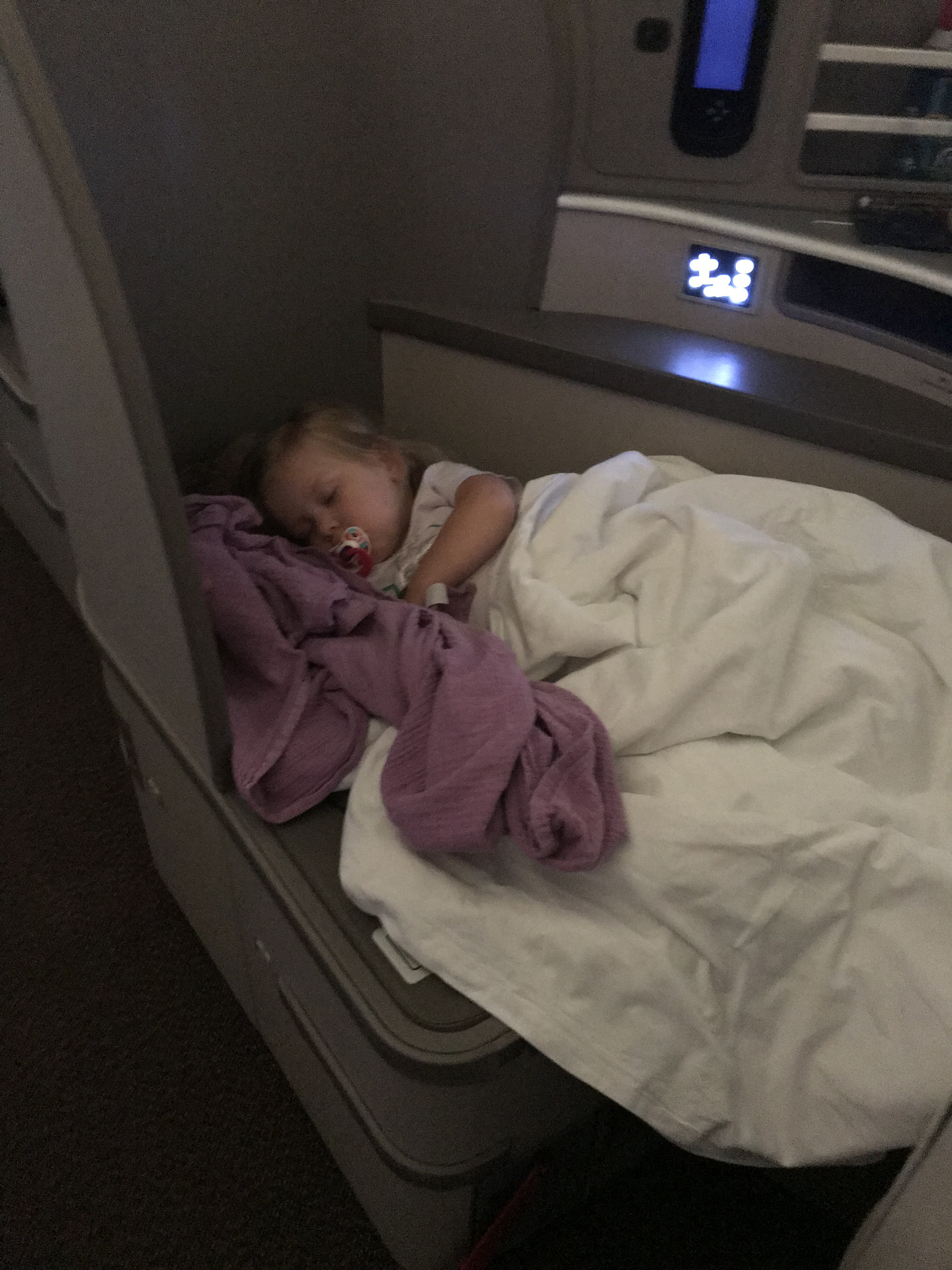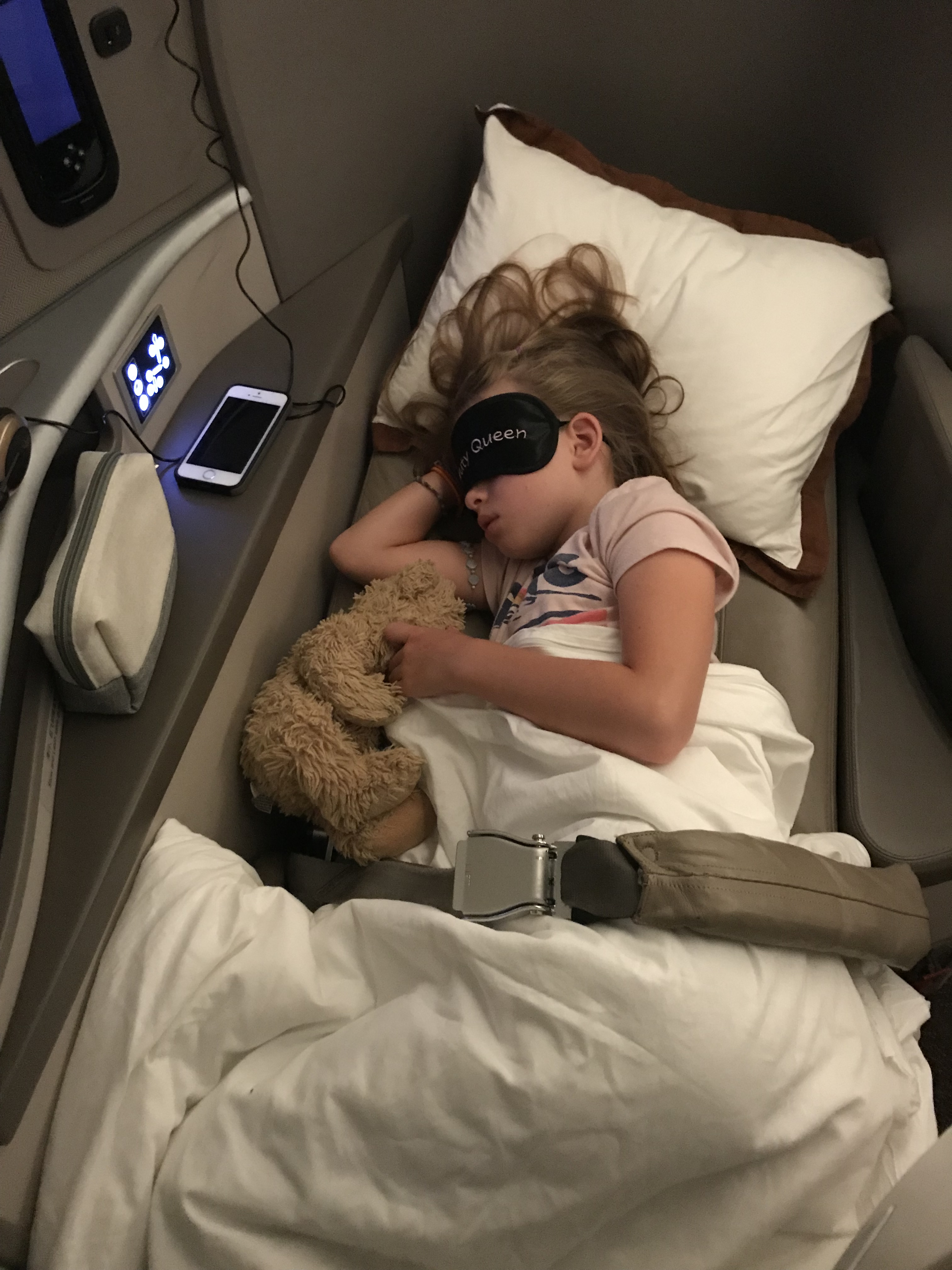The flight itself went smoothly. At the risk of sounding snobby I’m going to complain that the problem with flying business class with a toddler is that during take-off and landing she was so far away from me that I couldn’t hand her anything or physically comfort her or be helpful to her in any way. But once we were in the air Amirah watched a movie, ate some dinner and fell asleep. She slept for 12 hours, leaving less than an hour of the flight when she woke up. The other kids and Richard and I did some combination of sleeping and watching movies, and Simon was utterly delighted by the whole experience.
